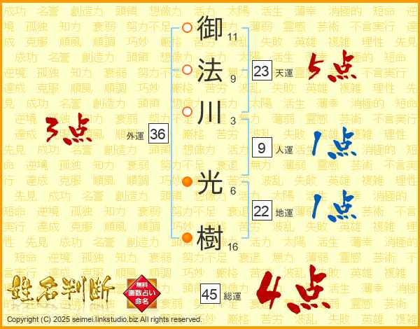 御(11画)法(9画)川(3画) 光(6画)樹(16画)
