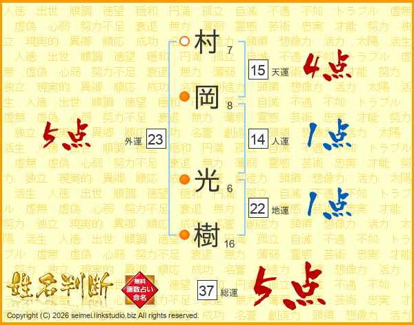 あなたの人生を表す1番重要な運勢です。生涯を通じて影響する総合運となり、主に50歳以降の晩年期に影響を及ぼします。苗字と名前の合計画数。