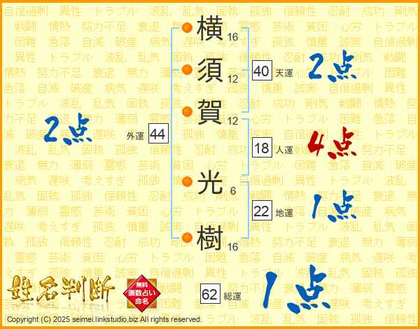 横(16画)須(12画)賀(12画) 光(6画)樹(16画)