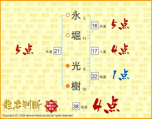 あなたの人生を表す1番重要な運勢です。生涯を通じて影響する総合運となり、主に50歳以降の晩年期に影響を及ぼします。苗字と名前の合計画数。