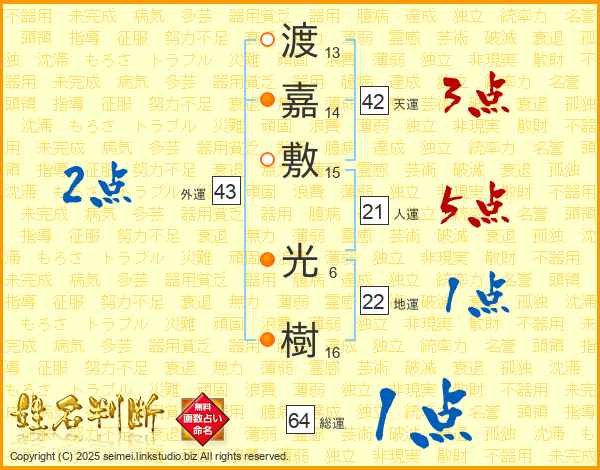 渡(13画)嘉(14画)敷(15画) 光(6画)樹(16画)