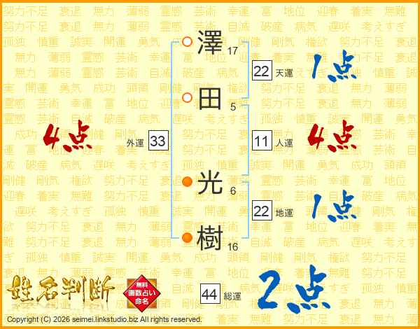 あなたの人生を表す1番重要な運勢です。生涯を通じて影響する総合運となり、主に50歳以降の晩年期に影響を及ぼします。苗字と名前の合計画数。
