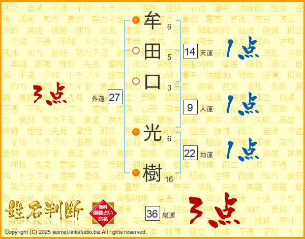 牟(6画)田(5画)口(3画) 光(6画)樹(16画)