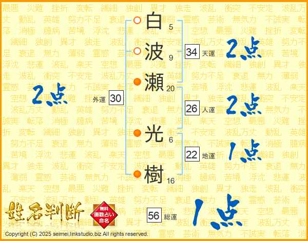 白(5画)波(9画)瀬(20画) 光(6画)樹(16画)