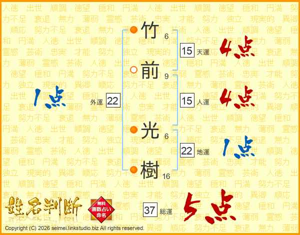 あなたの人生を表す1番重要な運勢です。生涯を通じて影響する総合運となり、主に50歳以降の晩年期に影響を及ぼします。苗字と名前の合計画数。