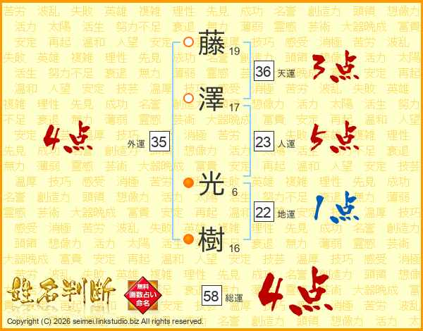 藤(19画)澤(17画) 光(6画)樹(16画)