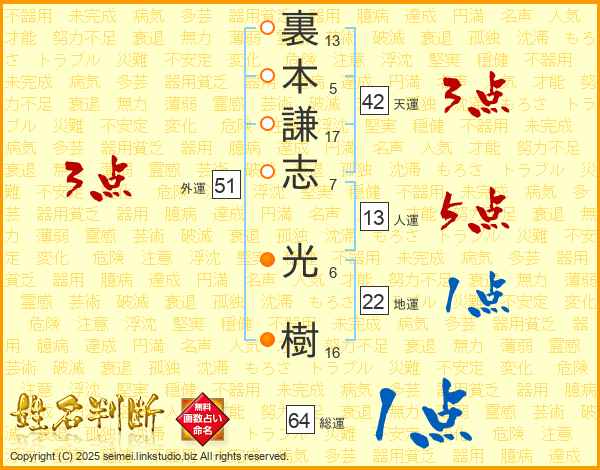 裏(13画)本(5画)謙(17画)志(7画) 光(6画)樹(16画)
