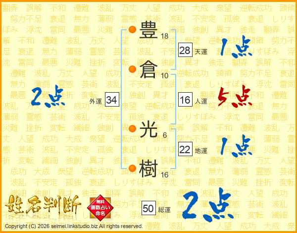 豊(18画)倉(10画) 光(6画)樹(16画)