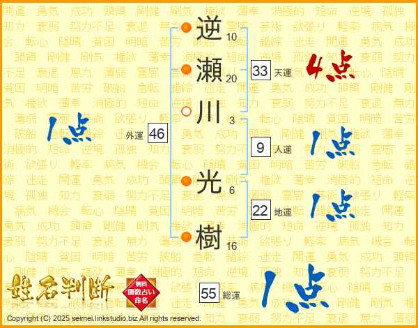 逆(10画)瀬(20画)川(3画) 光(6画)樹(16画)