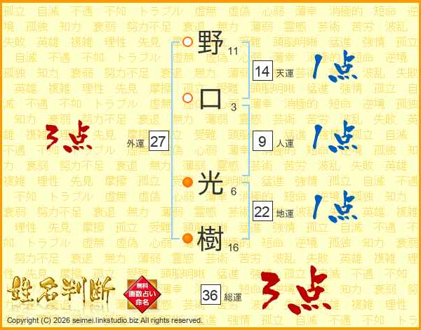 野(11画)口(3画) 光(6画)樹(16画)