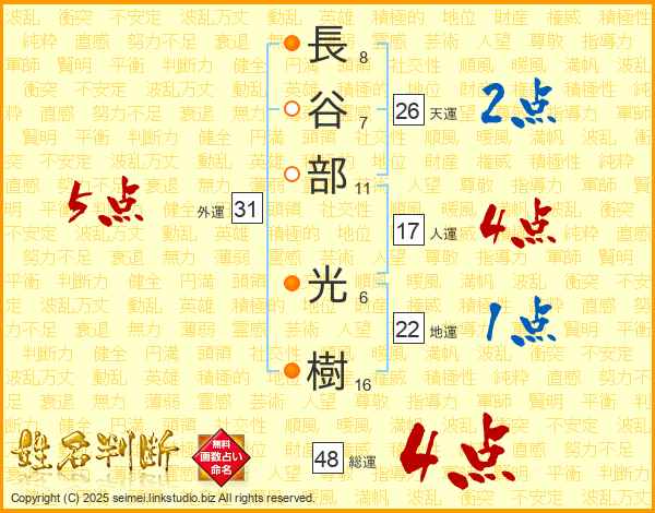 長(8画)谷(7画)部(11画) 光(6画)樹(16画)