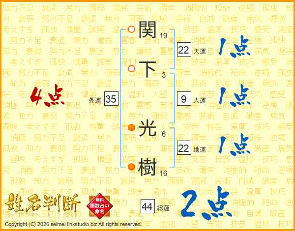 生活面を象徴する運勢です。外部から受ける影響力を表し、結婚運、家庭運や職場、環境への順応性を表します。総運から人運を引いた画数。姓や名が1文字の場合を除く。