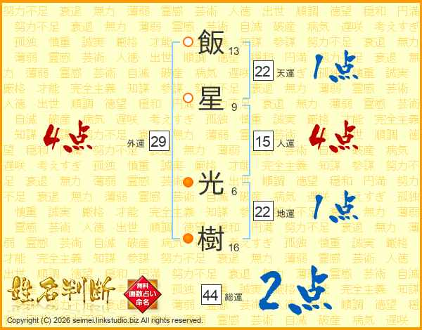 あなたの人生を表す1番重要な運勢です。生涯を通じて影響する総合運となり、主に50歳以降の晩年期に影響を及ぼします。苗字と名前の合計画数。