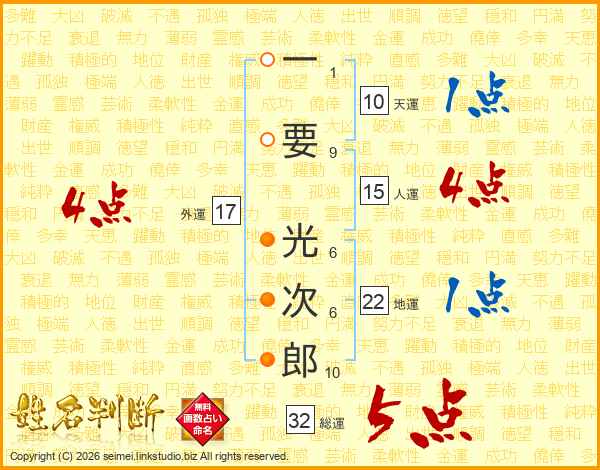 一(1画)要(9画) 光(6画)次(6画)郎(10画)