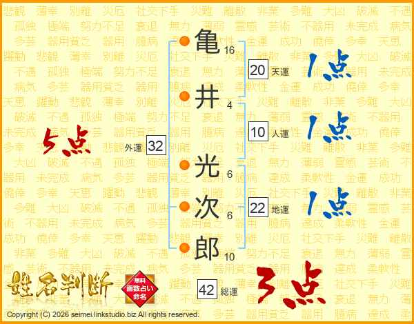 亀(16画)井(4画) 光(6画)次(6画)郎(10画)