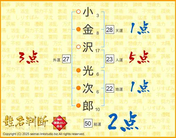小(3画)金(8画)沢(17画) 光(6画)次(6画)郎(10画)