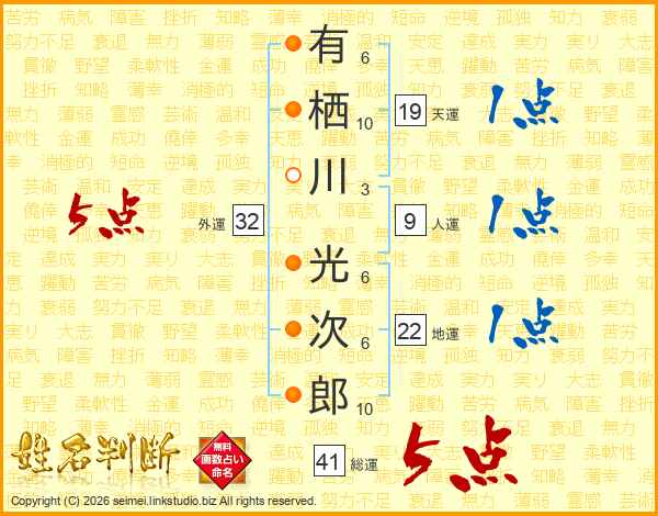 有栖川光次郎さんの総運は41画の5点!