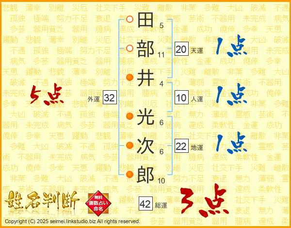 田(5画)部(11画)井(4画) 光(6画)次(6画)郎(10画)