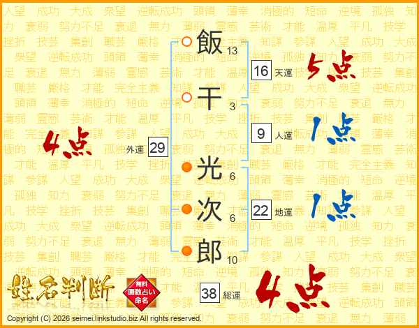 飯干光次郎さんの総運は38画の4点!