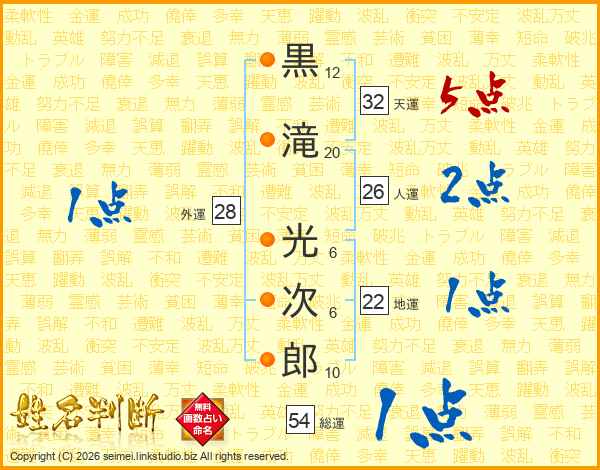黒(12画)滝(20画) 光(6画)次(6画)郎(10画)