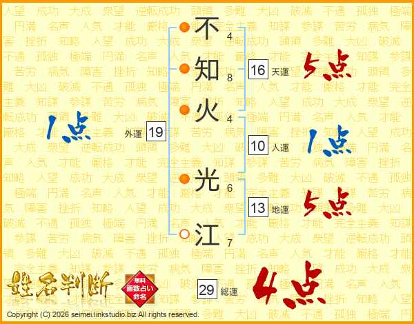 不(4画)知(8画)火(4画) 光(6画)江(7画)