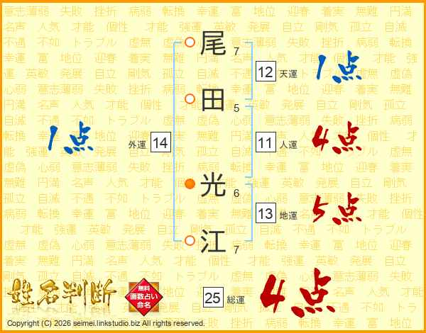 尾(7画)田(5画) 光(6画)江(7画)
