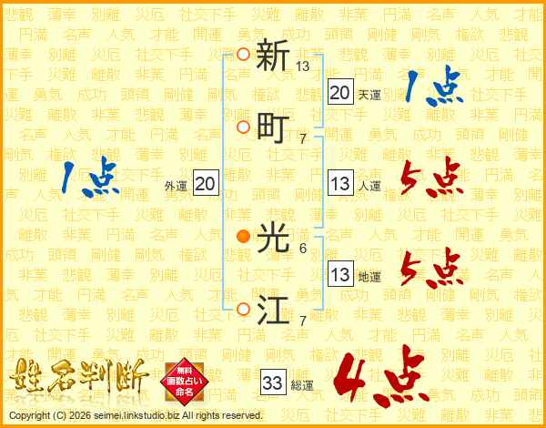 生活面を象徴する運勢です。外部から受ける影響力を表し、結婚運、家庭運や職場、環境への順応性を表します。総運から人運を引いた画数。姓や名が1文字の場合を除く。