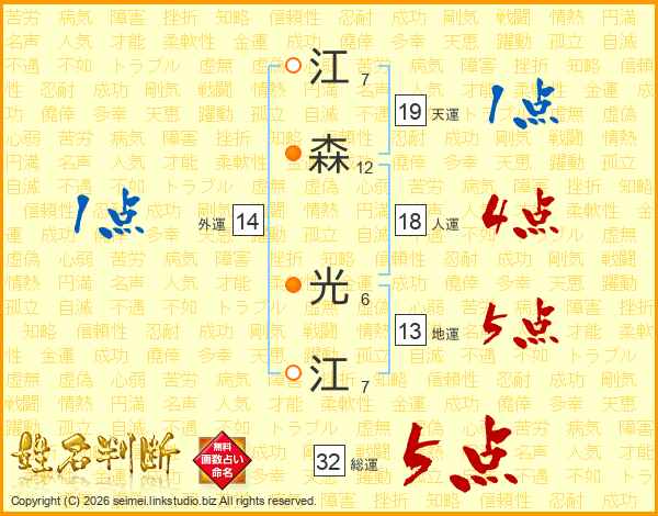 生活面を象徴する運勢です。外部から受ける影響力を表し、結婚運、家庭運や職場、環境への順応性を表します。総運から人運を引いた画数。姓や名が1文字の場合を除く。