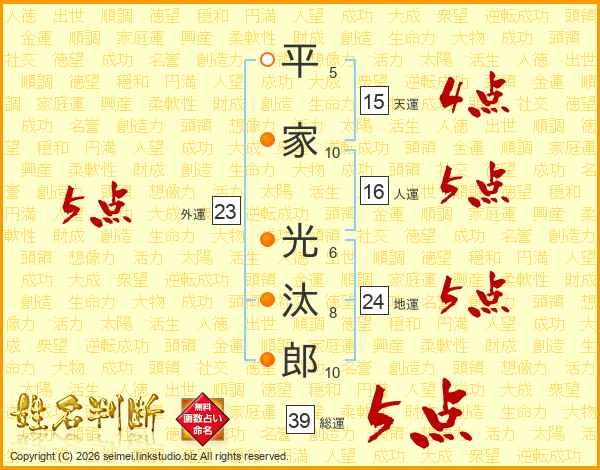 平(5画)家(10画) 光(6画)汰(8画)郎(10画)