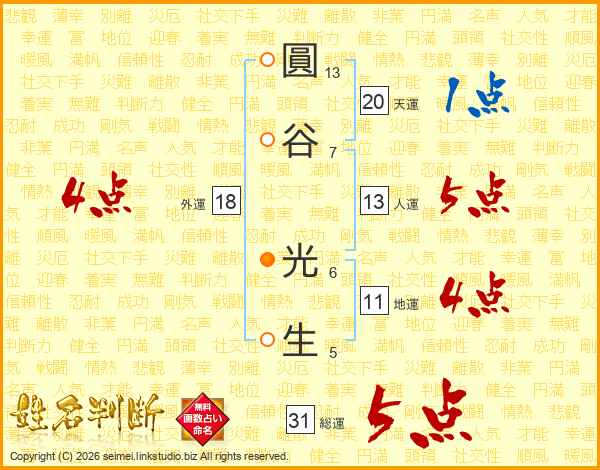 あなたの人生を表す1番重要な運勢です。生涯を通じて影響する総合運となり、主に50歳以降の晩年期に影響を及ぼします。苗字と名前の合計画数。