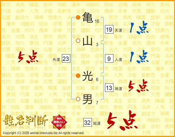 亀(16画)山(3画) 光(6画)男(7画)