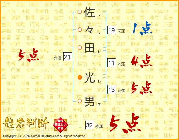 佐(7画)々(7画)田(5画) 光(6画)男(7画)