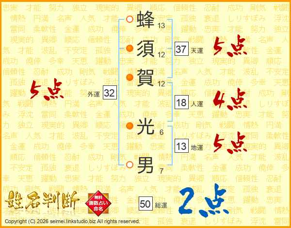 蜂(13画)須(12画)賀(12画) 光(6画)男(7画)