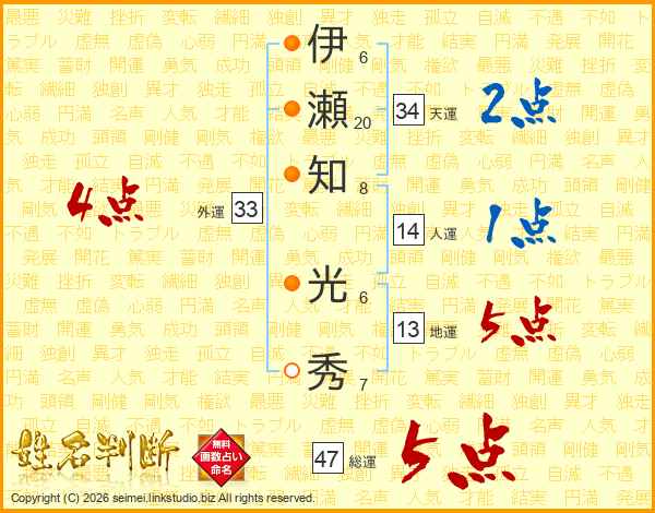 伊(6画)瀬(20画)知(8画) 光(6画)秀(7画)