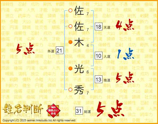 佐(7画)佐(7画)木(4画) 光(6画)秀(7画)