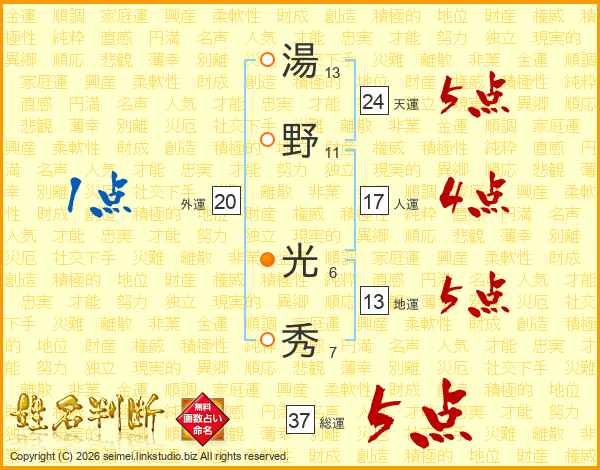 生活面を象徴する運勢です。外部から受ける影響力を表し、結婚運、家庭運や職場、環境への順応性を表します。総運から人運を引いた画数。姓や名が1文字の場合を除く。