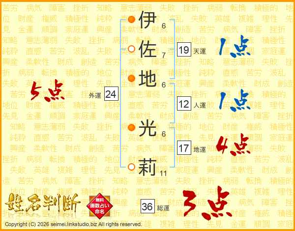 伊(6画)佐(7画)地(6画) 光(6画)莉(11画)