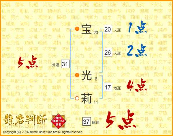 生活面を象徴する運勢です。外部から受ける影響力を表し、結婚運、家庭運や職場、環境への順応性を表します。総運から人運を引いた画数。姓や名が1文字の場合を除く。