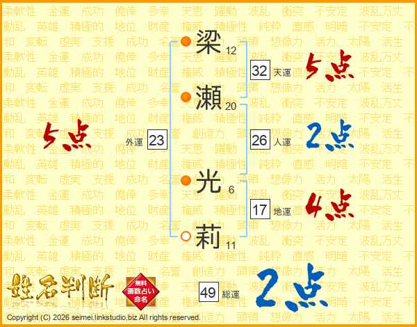 梁(12画)瀬(20画) 光(6画)莉(11画)