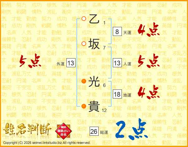 乙(1画)坂(7画) 光(6画)貴(12画)