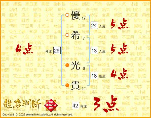優(17画)希(7画) 光(6画)貴(12画)