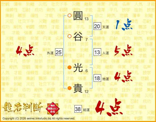 圓(13画)谷(7画) 光(6画)貴(12画)