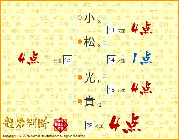 あなたの人生を表す1番重要な運勢です。生涯を通じて影響する総合運となり、主に50歳以降の晩年期に影響を及ぼします。苗字と名前の合計画数。