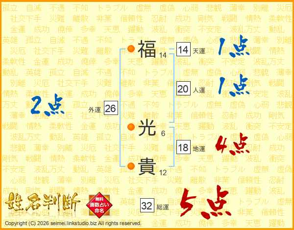 生活面を象徴する運勢です。外部から受ける影響力を表し、結婚運、家庭運や職場、環境への順応性を表します。総運から人運を引いた画数。姓や名が1文字の場合を除く。