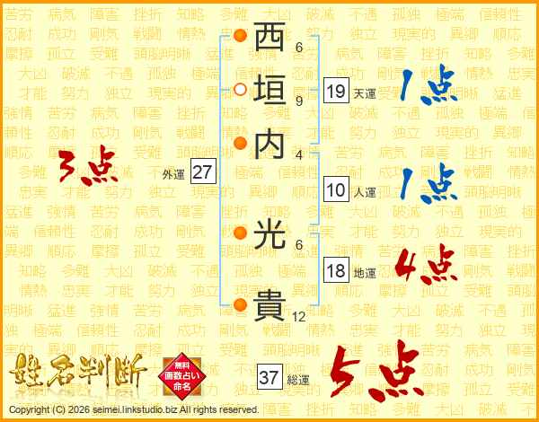 西(6画)垣(9画)内(4画) 光(6画)貴(12画)