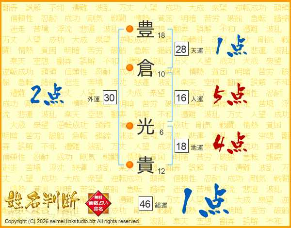 豊(18画)倉(10画) 光(6画)貴(12画)