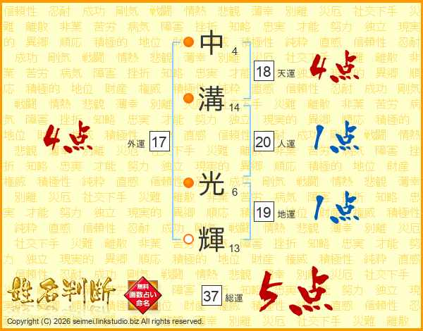 生活面を象徴する運勢です。外部から受ける影響力を表し、結婚運、家庭運や職場、環境への順応性を表します。総運から人運を引いた画数。姓や名が1文字の場合を除く。