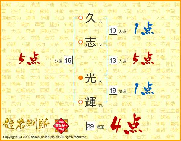 あなたの人生を表す1番重要な運勢です。生涯を通じて影響する総合運となり、主に50歳以降の晩年期に影響を及ぼします。苗字と名前の合計画数。
