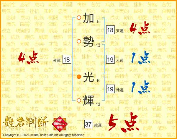加勢光輝さんの総運は37画の5点!