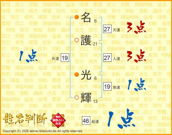 名(6画)護(21画) 光(6画)輝(13画)